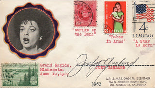 Attractive and uncommon signed FDC from the beloved singer and actress. The envelope with an affixed portrait of Garland and stamps which in some way relate to three films by Garland ("Strike up the Band," "Babes in Arms," "A Star is Born") and to Garland's birthplace of Grand Rapids, Minnesota. The cancellation is from 1963 and Garland has boldly signed in black ink.