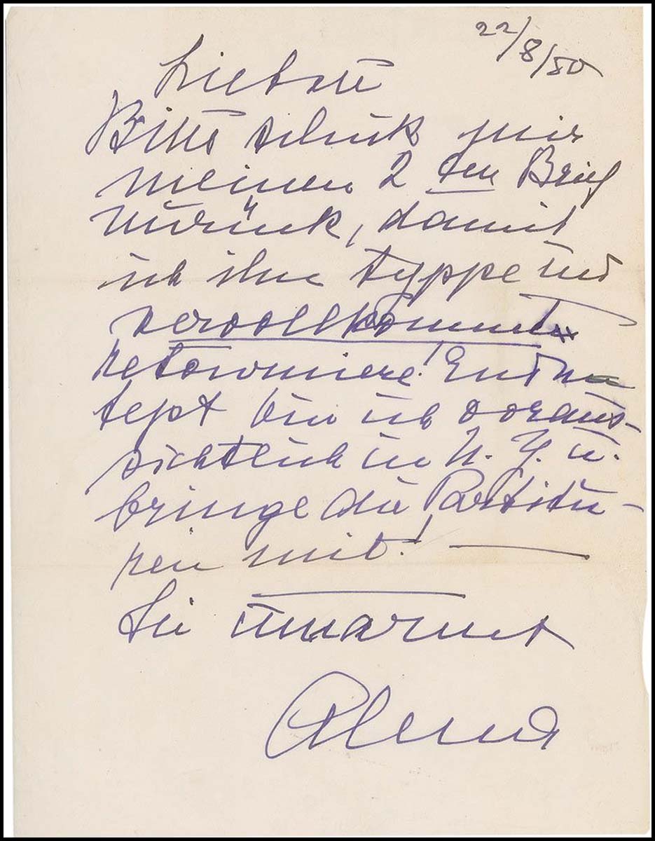Autograph letter from the great muse and wife, successively, of Gustav Mahler, Walter Gropius and Franz Werfel. 1 pp. Dated August 22, 1950. Boldly penned in her customary lavender ink. "Liebau, Please send my 2nd letter back to me, so that I can type and return it completed! I will presumably be in NY at the end of Sept. and will bring the scores with me. I embrace you, Alma." Usual creases, in fine condition.