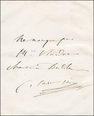 Saint-Saëns, Camille. (1835-1921). Autograph Note Regarding Viardot. A brief but wonderful autograph note, signed "C. Saint-Saëns," without date. In French: "Don't fail to come. Mme Viardot is going to sing Delilah." 1 page, 12mo. Mounted to a slightly larger page.