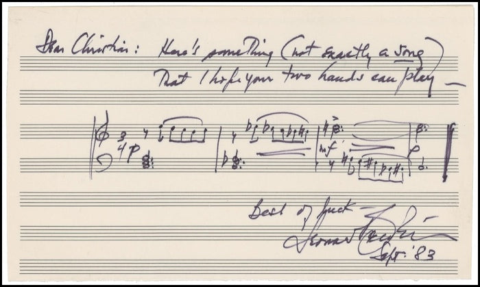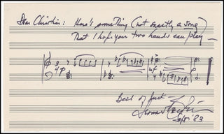 A short but highly interesting original musical manuscript of a theme, inscribed to the pianist Christian Zimmerman: “Here’s something (not exactly a song) that I hope your two hands can play—Best of luck—Leonard Bernstein Sept. ‘83.” In fine condition, neatly penned on an off-white 10 x 6 inch musically-lined page. This is apparently an unknown composition.