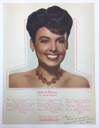 Unusual signed item from the late great singer/actress, a large mounted color magazine photograph over an original poem "Lady of Beauty (To Lena Horne)" neatly composed in red pencil by one Edna Lo Harrison in 1946. Horne has signed and inscribed the page in black ink "To Edna- Thank you for your very sweet interest - always, Lena Horne." The poem reads in full: "She has cute dimples in her cheeks, / and a twinkle in her eyes,/ Which makes those who really know her / Shout her praises to the skies. / She has a ready, beaming smile, / A sincertiy that's rare, / And the real warmth of her greeting / Has a very special flare. / Her universal beauty / Shines like a beacon of light / That seems to flow and make her / Most precious in His sight." 9 x 12 inches (23 x 30.5 cm) and in very fine condition.