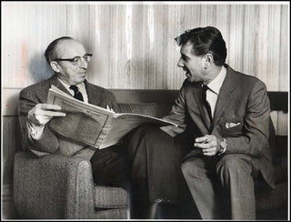 Original photograph of the two American composers together, as Bernstein prepared to conduct the NY Philharmonic in the world premiere of Copland's "Connotations for Orchestra." 9 x 7 inches, slightly rippled, else fine.
