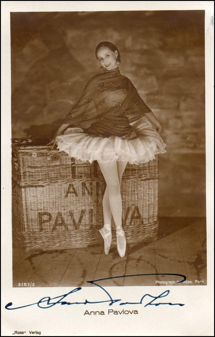 Pavlova, Anna. (1881-1931). Signed Photograph . Vintage signed sepia postcard photograph, an elegant full length image of the legendary ballerina standing en pointe before a large wicker trunk bearing her name. Photograph by Abbe of Paris. Signed by Pavlova in bold, dark blue fountain pen ink with her name alone to the lower white border. Three minor corner creases, otherwise very fine.