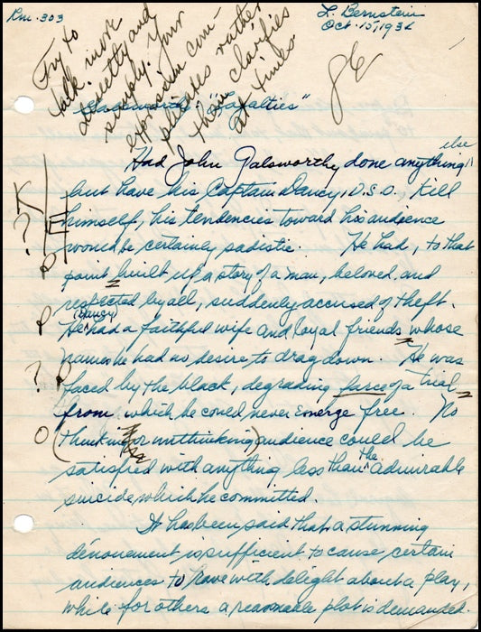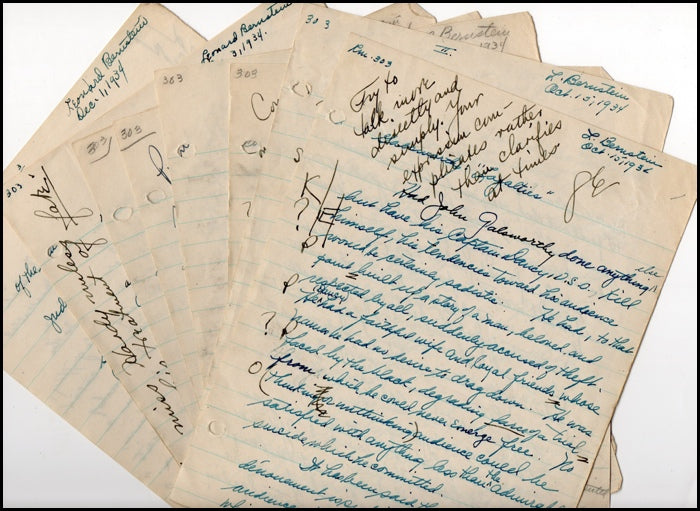 Bernstein, Leonard. (1918–1990). Archive of Childhood Book Reports. A superb and unusual group, being four book reports comprising 16pp. total, penned on 8vo. lined sheets by the 16-year-old future composer with revealing content about his thinking, poetic philosophy and striking linguistic style. Each report is signed at top right "L. Bernstein" and each bears numerous corrections and comments by Bernstein's often-exasperated teacher. In the first, 3pp. Oct. 15, 1934, Bernstein tackles John Galsworthy's short story "Loyalties": "Had John Galsworthy done anything else but have his Captain Dancy, D.S.O. kill himself, his tendencies toward his audience would be certainly sadistic. He had, to that point, built up a story of a man, beloved and respected by all, suddenly accused of theft‚ ¨He was faced by the bleak, degrading farce of a trial from which he could never emerge free‚ ¨¶It has been said that a stunning denouement is sufficient to cause certain audiences to rave with delight about a play, while for others a reasonable plot is demanded." Bernstein gives a quick plot summary, concluding: "Thus we find 'Loyalties' a pleasing combination of satisfaction and inevitability." The second report, 4pp., Nov. 13, 1934 regards Elmer Rice's popular play Street Scene: "‚ ¨Here is a so-called play which is not very far from not being a play; it is virtually a tableau. It might be‚ a quick succession of still pictures depicting life in that certain poor quarter of New York‚ ¨¶Let us first discuss the background. With this innovation in dramatic realism came a long cycle of play reflecting similar reality‚ ¨¶Previous to a decade or two ago, these every-day settings were not as common‚ ¨¶now we have Dreiser's 'Hand of the Porter'‚ ¨¶Mr. Rice obviously had the intention to show these people in many moods‚ ¨¶So we have brought together the warp of background and the woof of social study‚ ¨¶". The third, 3pp. in pencil, Nov. 19, 1934, discusses J. M. Barrie's theatrical war commentary, The Old Lady Shows Her Medals, in small part: "‚ ¨¶It is rather a subtle combination of social ideas and character that the author is concerned with‚ ¨¶Each of these women is continually being forcibly raised or lowered a peg, meeting with success or reverses, but never ceasing the execution of their excuse for living‚ ¨¶Though this act of 'Keeping up with the Joneses' is by no means one restricted to the servant classes, let us take the four women as the exponents of the principle‚ ¨¶From this small, apparently light one-act play, we may easily draw upon the principle herein involves‚ ¨¶Is not the fact that men never tire of outdoing each other responsible for wars?...". Report number four from Dec. 3, 1934 encompasses four pages of Bernstein's thoughts upon Hardy's Jude the Obscure, with typically-opinionated commentary, such as noting that the author's theme is "‚ ¨¶quite ordinary, quite like the run of realists' chatter, the case of the flitting bride..." and concluding: "I think Hardy is commonplace. I grant that he is unusually well-read and can tell a story convincingly; else he would never hold the rank he does‚ ¨¶Yet I cannot discover anything in this book that might not appeal to me in simpler language‚ ¨¶The story is reminiscent of the gay-nineties melodrama!...". Bernstein's teacher has marked-up each essay considerably, with reproving notes throughout such as: "Try to talk more directly and simply. Your expression complicates rather than clarifies at times", "Too much embroidery; too much indirection. Clear, hard thinking should produce exact, direct, virile expression", and "Prune your style‚ ¨¶You are too much concerned with the embroidery and too little with the substance of your material"!