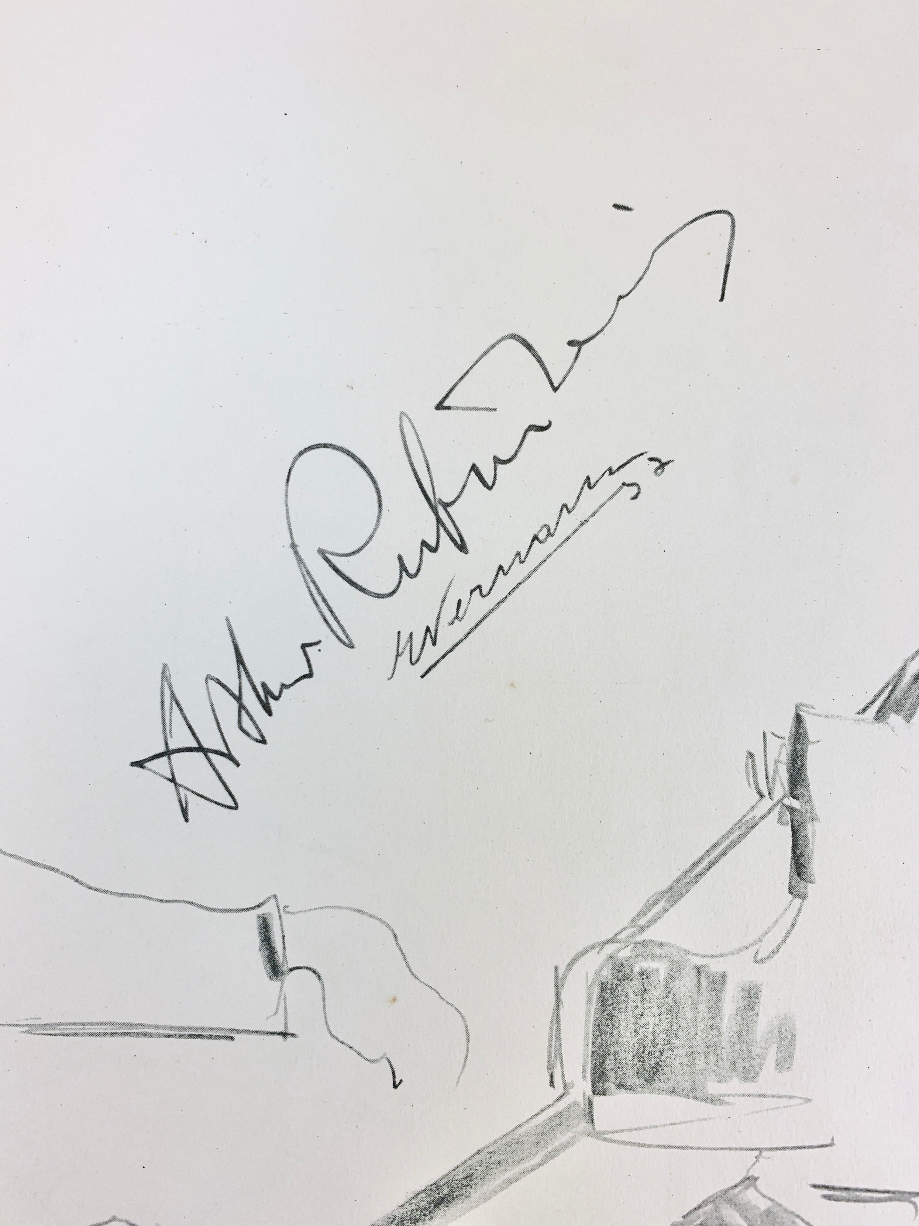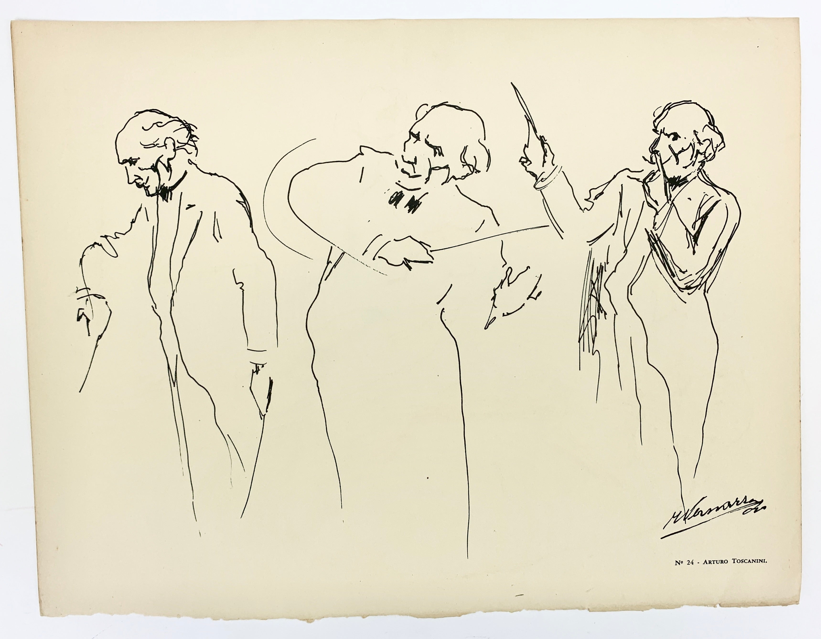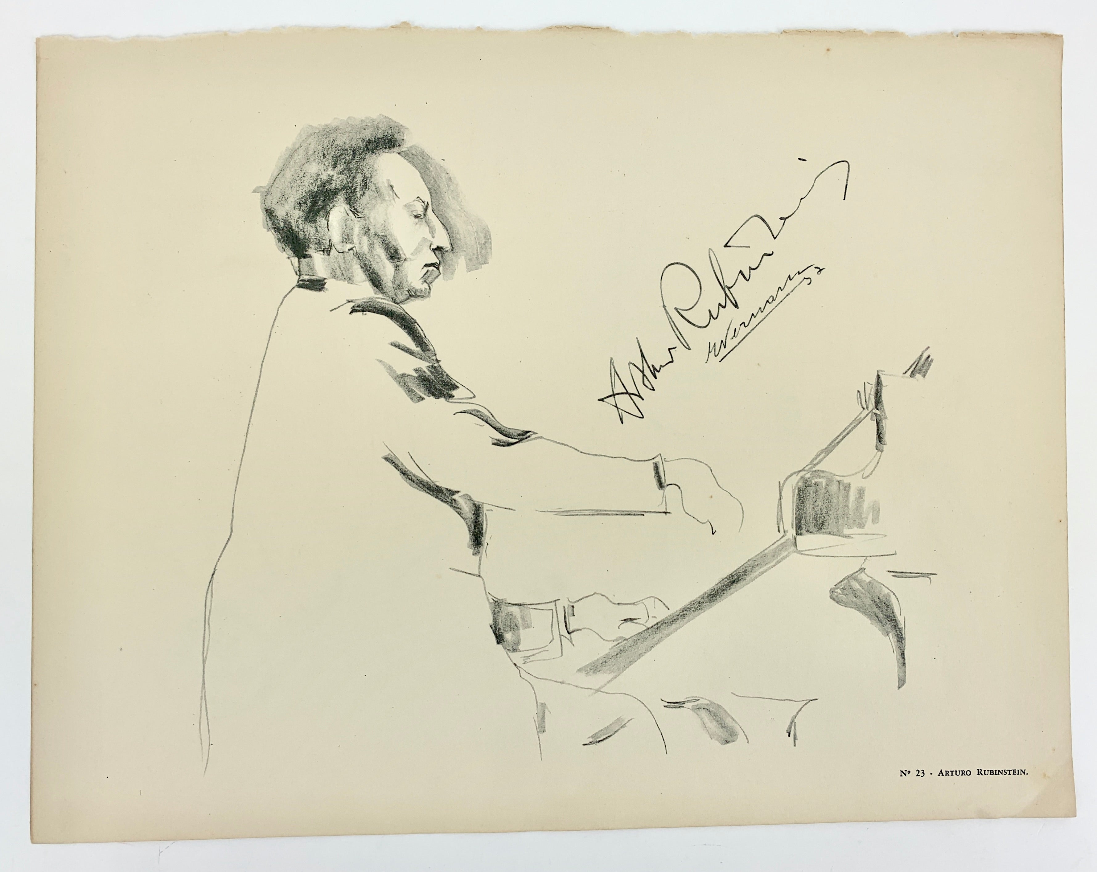 Original print of a 1926 drawing by M. Vernarra, showing Rubinstein seated at the piano and with a facsimile of his signature to the right. On the verso, a drawing by M. Vernarra, showing Toscanini in three lively conducting poses. Single leaf, one edge rough, apparently this having been removed from a volume of similar illustrations depicting notable musicians, composers, and conductors. Overall fine. 10 x 13 inches (25 x 33 cm.).