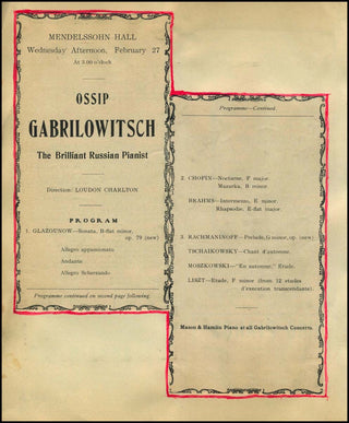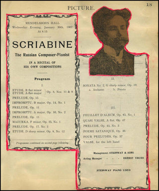 Rare original program from a performance of the Russian composer and pianist at Mendelssohn Hall (NY) in 1907. The program consisted entirely of Scriabine's own compositions. Both pages of the program have been neatly trimmed and mounted to a page together with an inset trimmed portrait. The page verso includes similar program clippings from an Ossip Gabrilowitsch recital at the same location the following month. 28 x 19 cm overall.