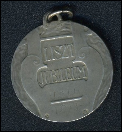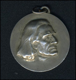 Fine silvered portrait medal of the Hungarian virtuoso pianist and composer, signed "Rigele A." on the obverse, beneath a bust portrait. The verso with an art deco design, inscribed "LISZT JUBLEUM 1811 / 1911." The top of the medal with a double loop for attachment to a pin or chain. In very fine condition. 30 mm.
