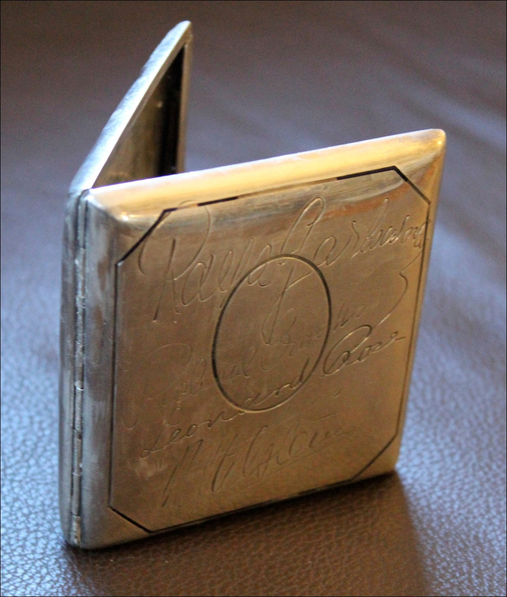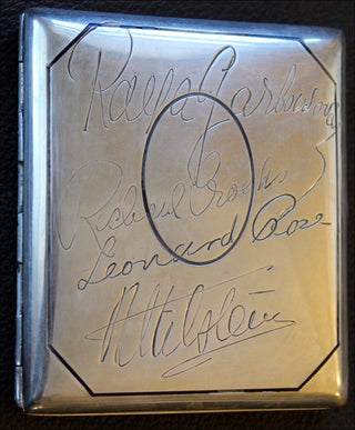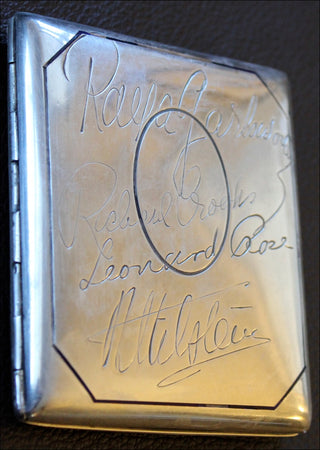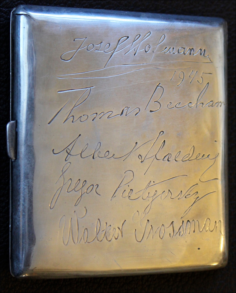 [Musician Signed Cigarette Case] Hofmann, Rose, Milstein, etc. Inscribed Silver Cigarette Case. One-of-a-kind vintage cigarette case from the 1940’s with etched/incised signatures of some of the 20th century's greatest musicians: Josef Hofmann, Thomas Beecham, Albert Spalding, Gregor Piatigorsky, Walter Grossman, Raya Garbousova, Richard Crooks, Leonard Rose, and Nathan Milstein. 90% silver, stamped ‘900’ on the bottom inside of the case. 3.5 inches long, 3.25 inches wide, and .75 inches tall. 3.64 troy ounces. Two elastic straps inside intended to hold cigarettes.