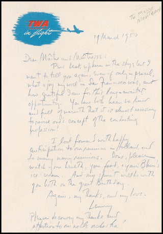 Autograph letter in pencil, signed “Lenny,” one page, 7.25 x 10.5, TWA In Flight letterhead, March 19, 1950. Letter addressed to “Maitre and Maitresse,” [Mr. and Mrs. Pierre Monteux]. In part: “Pens leak up here in the sky; but I want to tell you again, even if only in pencil, what a joy my week in San Francisco was, and how grateful I am for this long-awaited opportunity. You have both been so kind and full of warmth that it is almost necessary to revise one’s concept of the conducting profession!” After his signature, Bernstein adds: “Please do convey my thanks and affection to our whole orchestra!”
