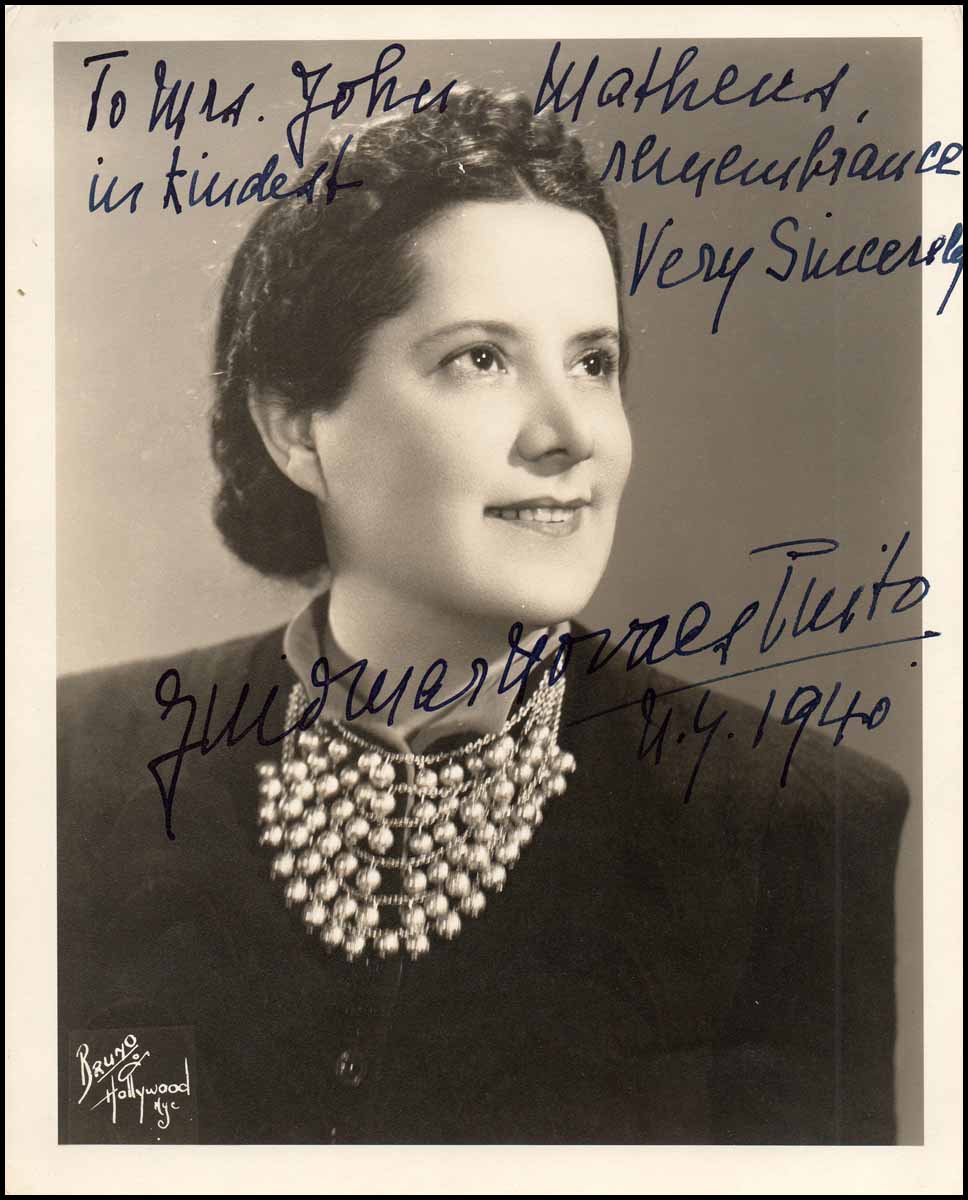 Novaës, Guiomar (1895-1979). Signed Photograph. Signed glossy Bruno of Hollywood photograph of the great Brazilian pianist. 20 x 25 cm and in fine condition.