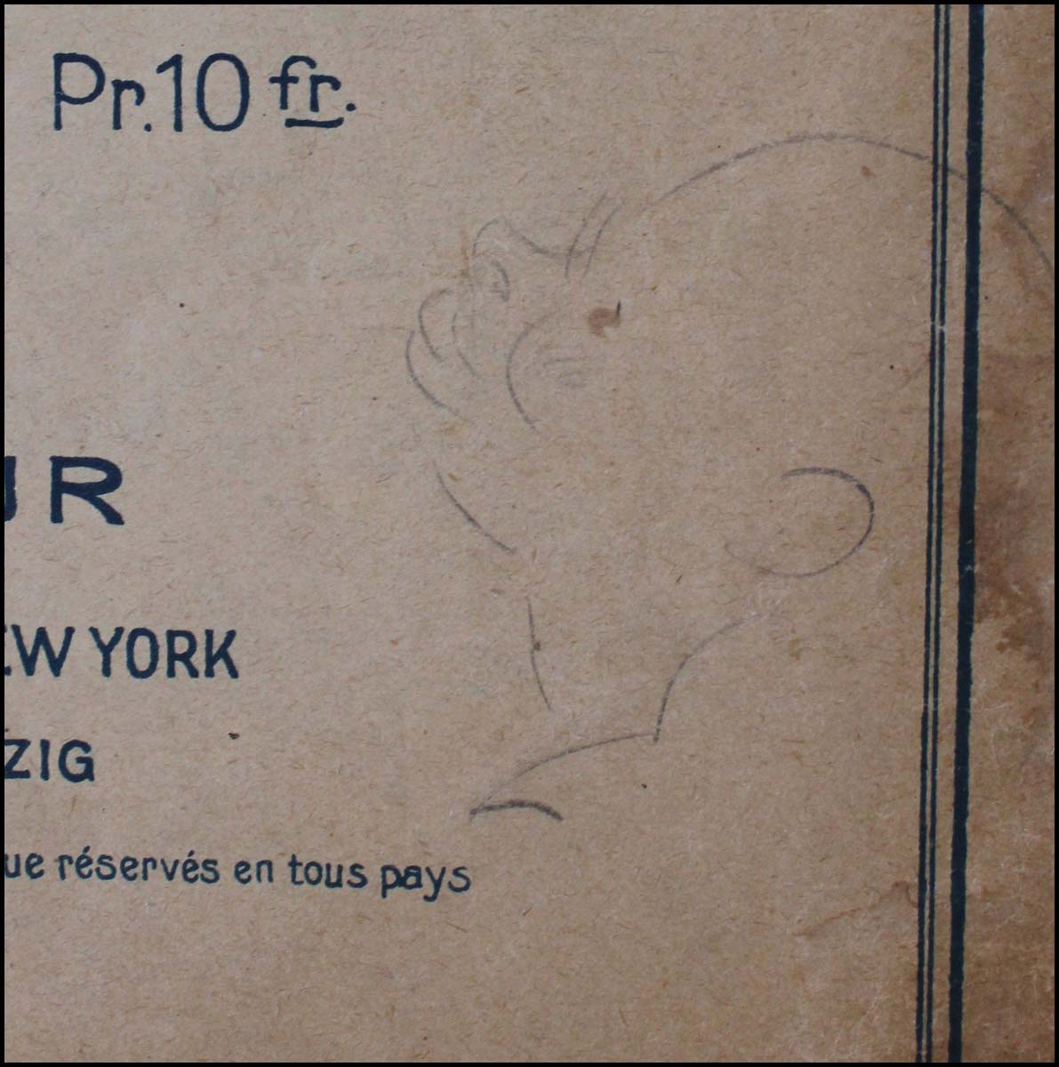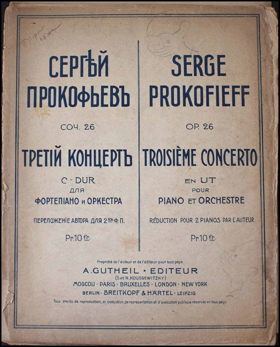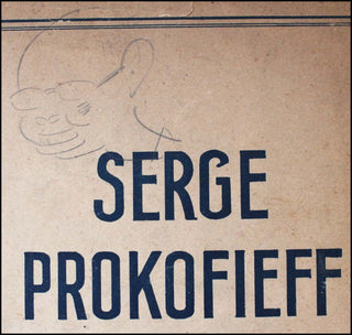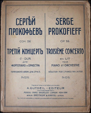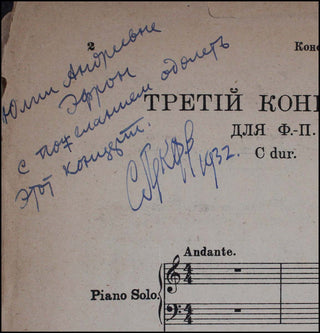 Prokofieff, Serge. (1891-1953). Troisième Concerto en Ut pour Piano et Orchestre, Op. 26. - Signed and Inscribed. Moscow: A. Gutheil. [1923]. First edition. Réduction pour 2 Pianos par l'auteur. Upright folio. 71 pp. [PN] 10322. Inscribed, signed and dated 1932 by the composer in blue ink in Cyrillic at the had of the first page and with two evocative pencil drawings of the composer in an unknown hand on the front cover. Toned, a few pages with light fingerings in pencil, edges lightly chipped and with a large tear through one leaf (page 65-66), disbound with most pages loose or fully separated. Signed scores from the composer are rare.