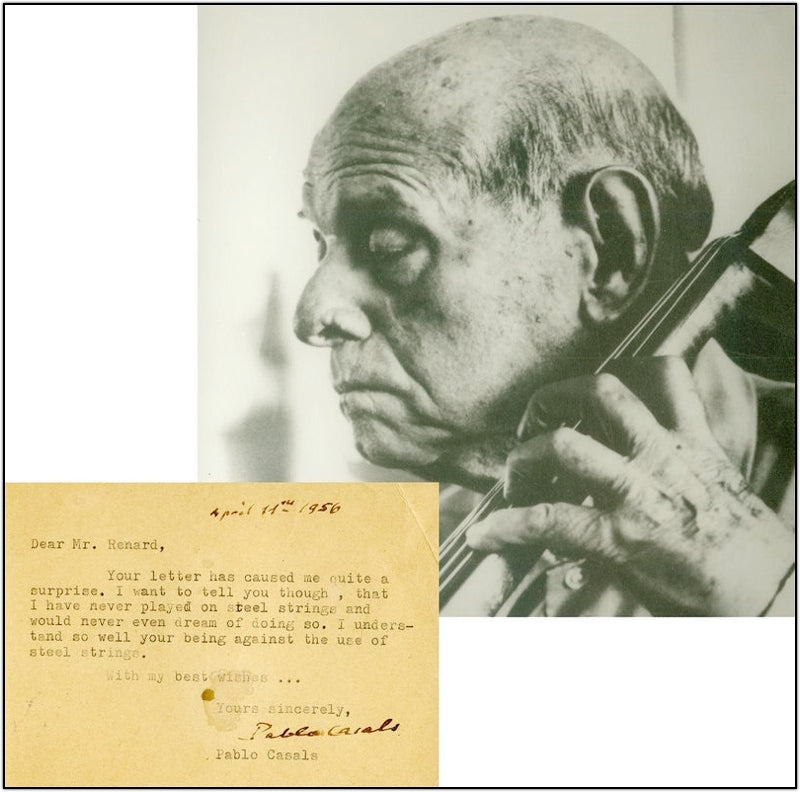 TLS on correspondence card, 5"x31/2", n.p., Apr 14, 1956. From the great Spanish composer, conductor, and cellist, one of the most influential musicians of the 20th century, also well known as a humanitarian. To Mr. Renard regarding his use of steel strings. In part: "Your letter has caused me quite a surprise. I want to tell you though, that I have never played on steel strings and would never even dream of doing so. I understand so well your being against the use of steel strings..." Darkly signed in black ink, adding date above text. Tiny smudge of single letter; light dampstain touching last sentence and first word of closing of no affect to legibility; else VG/Fine. Attractively double matted beneath very nice b/w close-up with cello, 7"x71/4". Overall 12"x16".