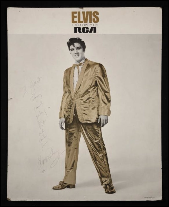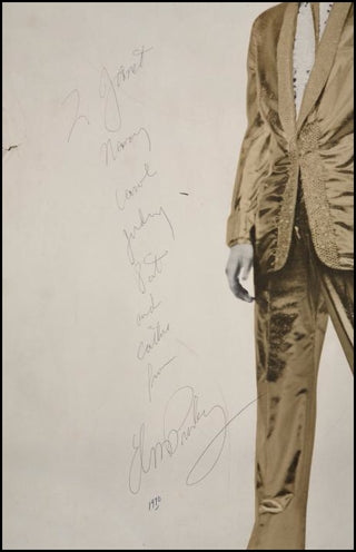 Presley, Elvis. (1935-1977). Enormous Signed Photograph in his Famous Gold Suit. An "Elvis Exclusively on RCA" promotional display standee that was used in record stores in the 1970s but which shows Elvis in his famous gold lamé suit in 1957, as seen on his album "Touch of Gold." The iconic image was inscribed by Elvis at a Las Vegas concert, "To Janet Nancy Carol Judy Pat and Catherine from Elvis Presley." Measuring an astonishing 28 x 21 inches, this is perhaps the largest and most visually striking Elvis signed photograph ever to be on the market.