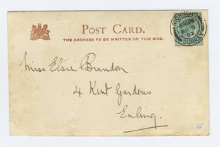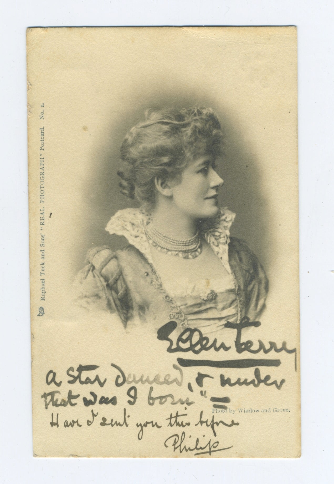 Postcard portrait photograph of the English actress, who has signed and inscribed within the negative: "A star danced, and under that I was born, Ellen Terry." Ca. 1902. Inscription in ink in an unknown hand beneath reads: "Have I sent you this before / Philips". Terry ruled the English stage in her day and was a favorite of George Bernard Shaw. Mild foxing; overall fine. 3.4 x 5.5 inches (8.6 x 13.9 cm.).