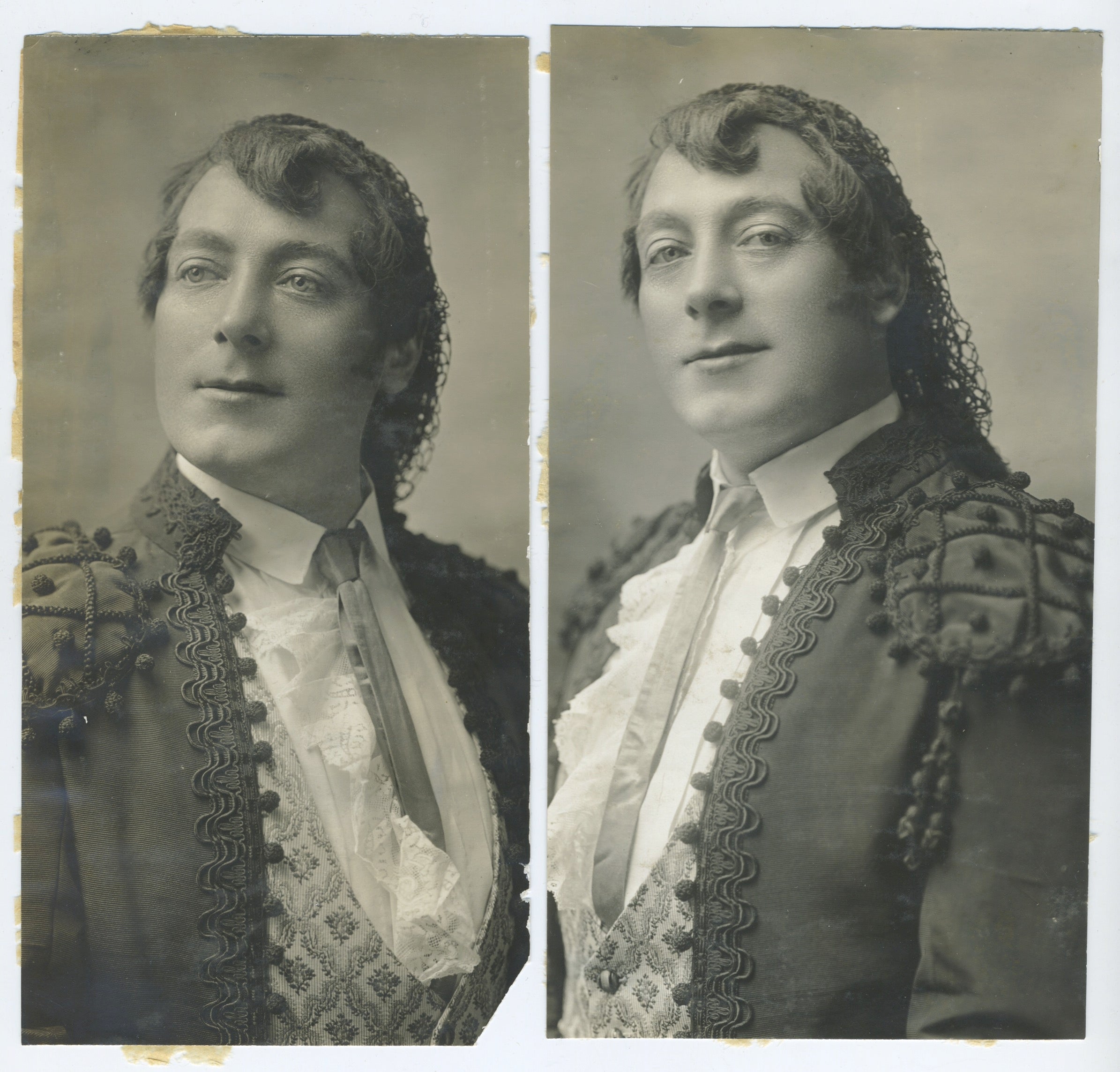 Pair of original photographs of the supreme Italian baritone in costume as Escamillo in Carmen. Mounting traces, one corner broken, else fine. 3.5 x 7 inches (9 x 18 cm).