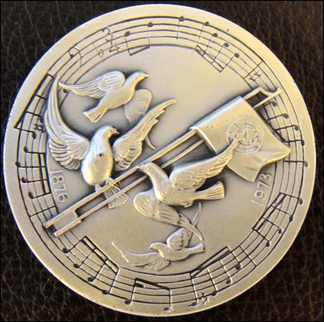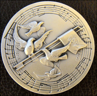 Fine solid silver [".999 Pure Silver"] medal of the great cellist, struck in very high relief by Medallic Art Co. The recto featuring Casals in profile with his cello, the verso with music, Peace doves encircling his bow, draped with a U.N. flag. Very fine. 50 mm.