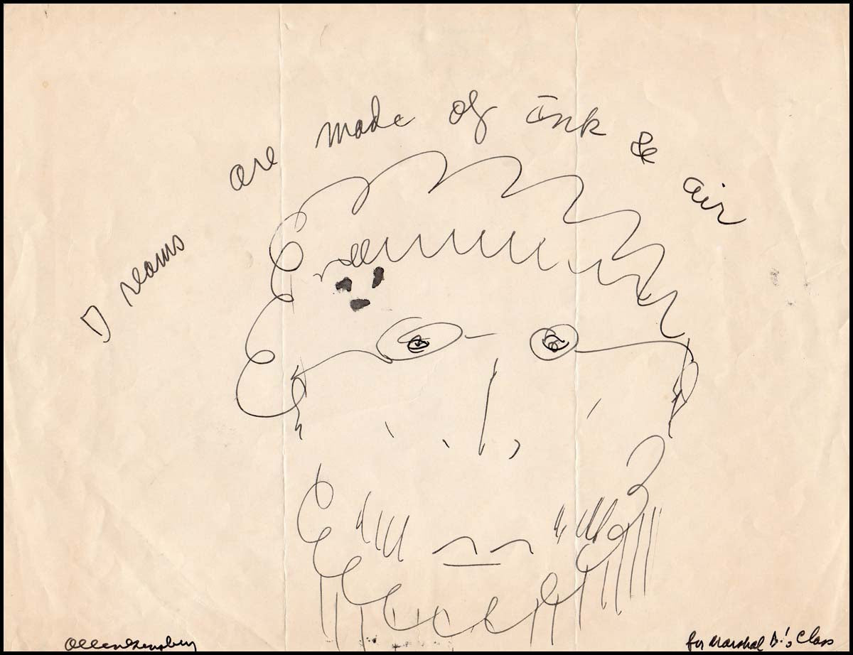 A fabulous signed item from the celebrated American poet of the "Beat Generation", author of "Howl" and "Kaddish". An ink drawing of a man's head executed on a 10" x 8" sheet, inscribed at top: "Dreams are made of ink & air", signed at bottom left. Light wear, a small fold tear or two, very good.