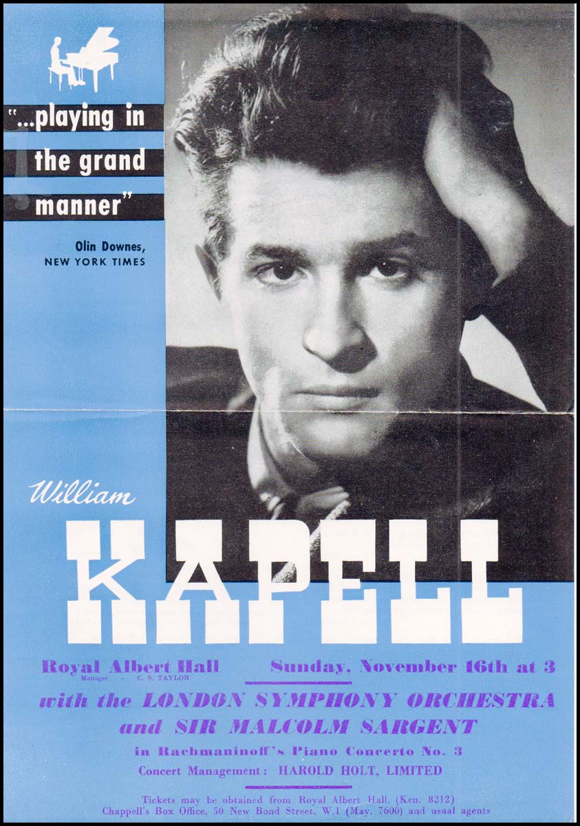 Kapell, William. (1922-1953). Original Program. Vintage Royal Albert Hall program from the great pianist whose flourishing career was cut tragically short by a plane crash on the way back from Australia. Copland wrote of him: “ I cannot conceive of his ever having given a dull performance – an erratic one, perhaps, a misguided or stylistically incongruous one maybe, but invariably one that was electric and alive.” Photograph printed broadside probrm from an appearance with the London Symphony under Sir Malcolm Sargent. Central horizontal crease, else fine.