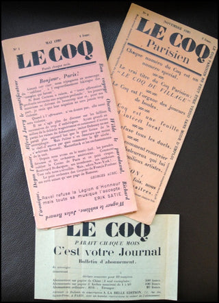 [Satie, Erik. (1866–1925)] [Cocteau, Jean. (1889–1963)]. Le Coq - Issues 1 & 4. Very rare first and fourth issues of the influential magazine. No. 1, Mai 1920; No. 4, Novembre 1920 [appearing as "Le Coq Parisien"]. Large single-sheet, single-sided format, trifolded for distribution, each panel 14 x 27.5 cm, expanding into fully printed newspaper format (42 x 55 cm). Fragile pink paper, some splitting and toning along the folds, overall fine (both issues). Together with a subscriptiont ticket.