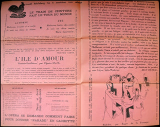"While appearing to imitate Picabia's '391' with its folded format, fragmented text and variegated typography, 'Le Coq' surpassed it completely with its sparkling cocktail of anti-Dada wit, 'désinvolture', high spirits and gaiety that sought to celebrate the 'pure' French spirit...The first [issue], in pale pink, included a text on the cover by Auric entitled 'Bonjour, Paris!'. This was followed inside by a statement of faith from Satie (essentially a two-fingers up at Ravel), a protest by Radiguet against a Frenchman's obligation always to be an intellectual and a side-swipe at Stravinsky while celebrating his rival Schoenberg. All the numbers of 'Le Coq' took as their principal theme variations of the slogan that appeared in the first issue: 'Return to poetry. Disappearance of the skyscraper. Reappearance of the rose.' " (James S. Williams, "Jean Cocteau", p. 96 - 97)