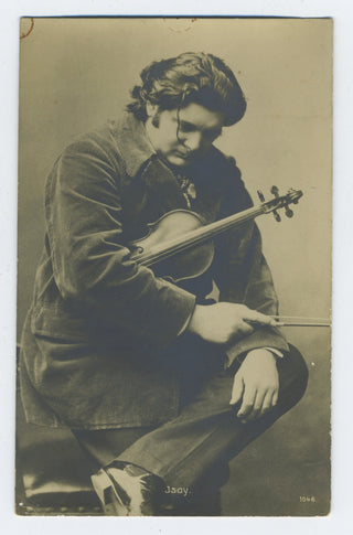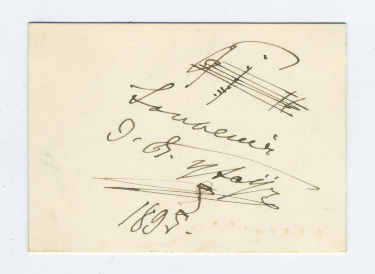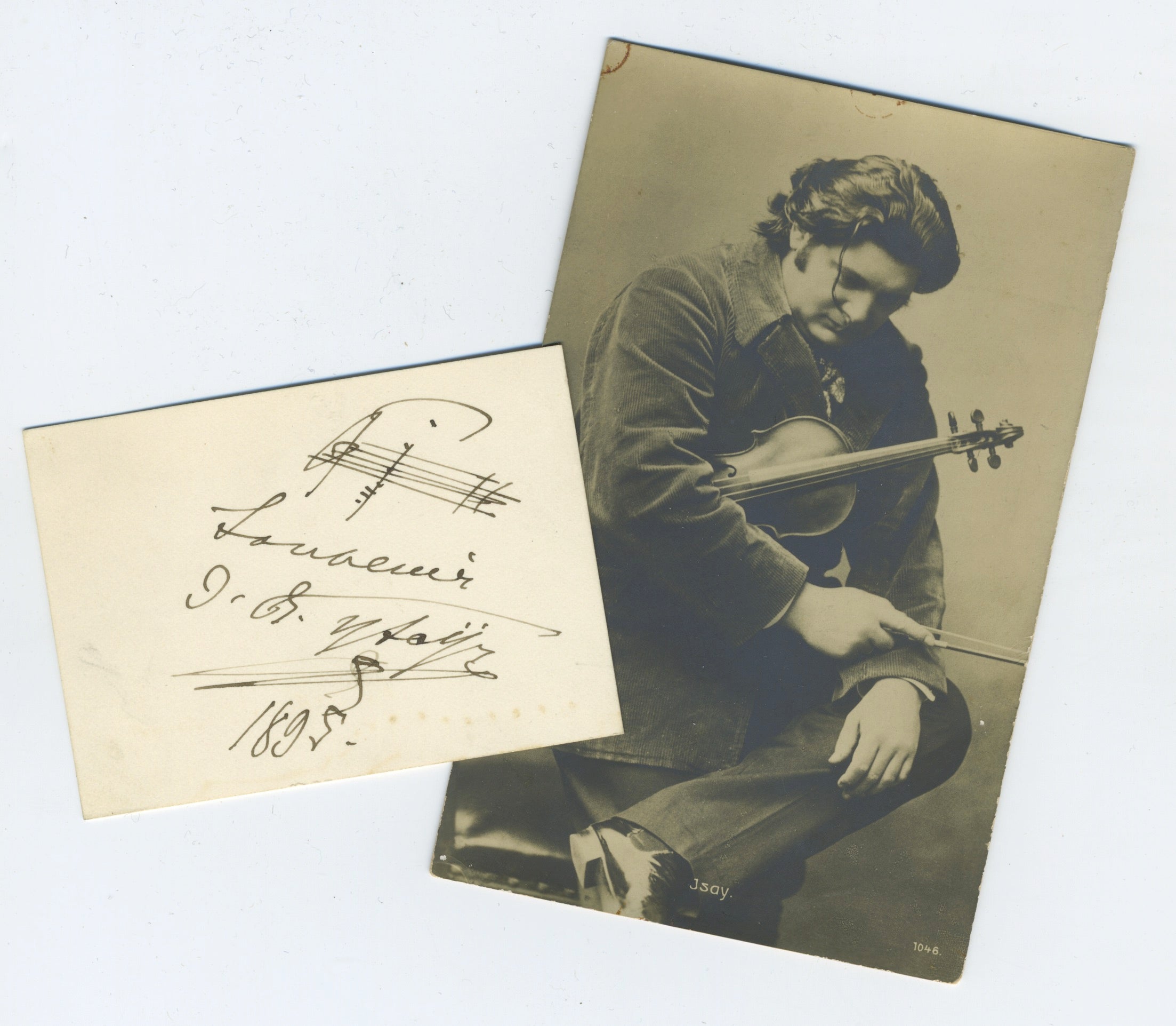 Ysaye, Eugene. (1858–1931). AMQS and Postcard Photograph. A single chord autograph musical quotation from the great fiddler, boldly penned on a card and signed "Souvenir de E. Ysaye / 1895." Sold together with a vintage postcard photograph.