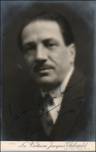 Undedicated signed postcard photograph of the masterful French violinist. Signed "Jacques Thibaud. Paris, 12 Juin 1924." Mild silvering around edges, otherwise in fine condition.