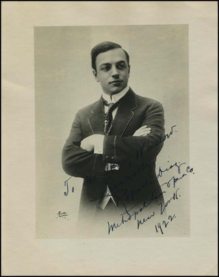 Diaz, Rafaelo. (1883 - 1943). Signed Photograph. Uncommon signed photograph of the Texas-born Cuban/American tenor, inscribed to Winslow, "Sincerely Rafaelo Diaz Metropolitan Opera Co. New York 1922." 8 x 10 inches, a few light creases, overall fine. With an Autograph Letter Signed, sending the photograph and $5 to "make some lad happy." New York, 1922