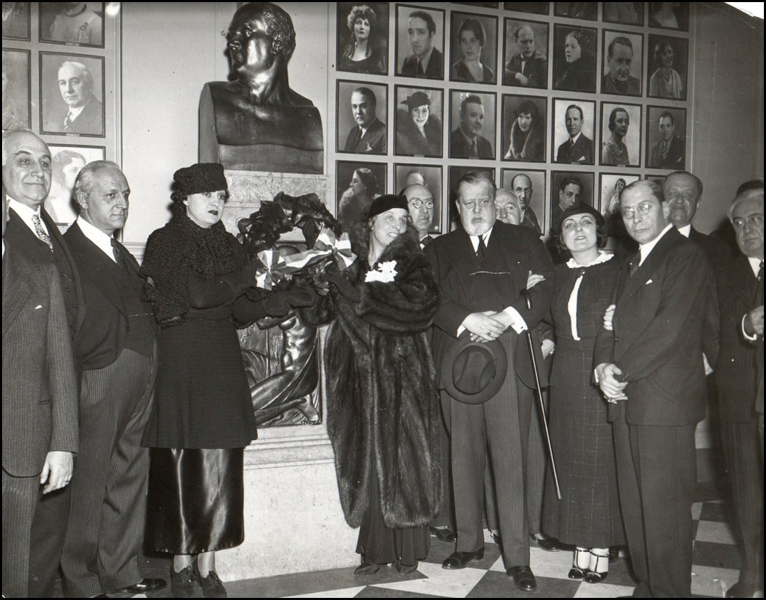 Rare original photograph of Rosa Ponselle, Geraldine Farrar, Mr. and Mrs. Gatti- Cassazza and other operatic celebrities gathered in the lobby of the Metropolitan Opera House to place a wreath on the memorial bust of Caruso. Dated 3-3-1935, 8.25 x 6.5 inches. Small tear to upper right corner, else fine.