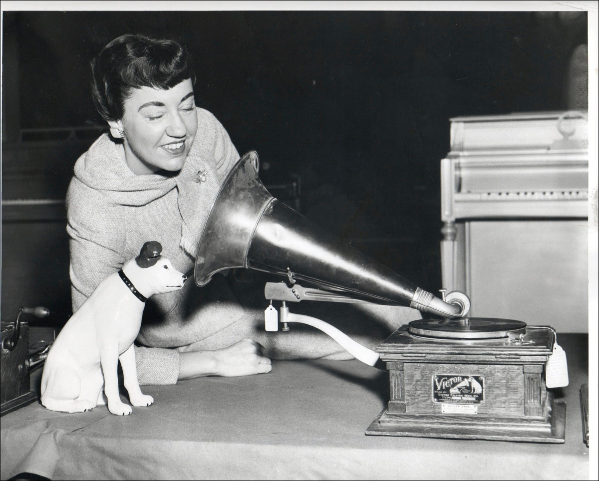 Unusual 8 x 10 inch photograph of a woman listening to a phonograph with a plaster cast of the little white dog that became known as the mascot of "His Master's Voice."