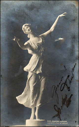 Unusual original photograph of a sculpture of the great dancer and choreographer - one of the major inovators of the medium - signed by Duncan in black fountain pen ink. Duncan was a great influence on numerous artists in many mediums and was the subject of many important sculptures. The Musée Bourdelle in Paris has recently mounted an exposition titled "Isadora Duncan: Une Sculpteur Vivante" which included images of the present 1904 sculpture by Walter Schott. Original postcard photograph, 9 x 15 cm, somewhat silvered, mounting traces on verso, small surface tear, and with the start of the signature and inscription a bit smudged but otherwise good.
