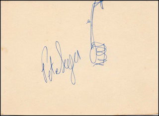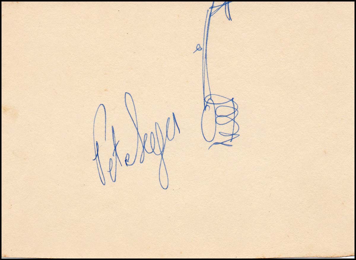 Signed drawing of a banjo from the American folk singer, an iconic figure in the mid-20th century American folk music revival. On a card measuring 10 x 14 cm and in very fine condition.