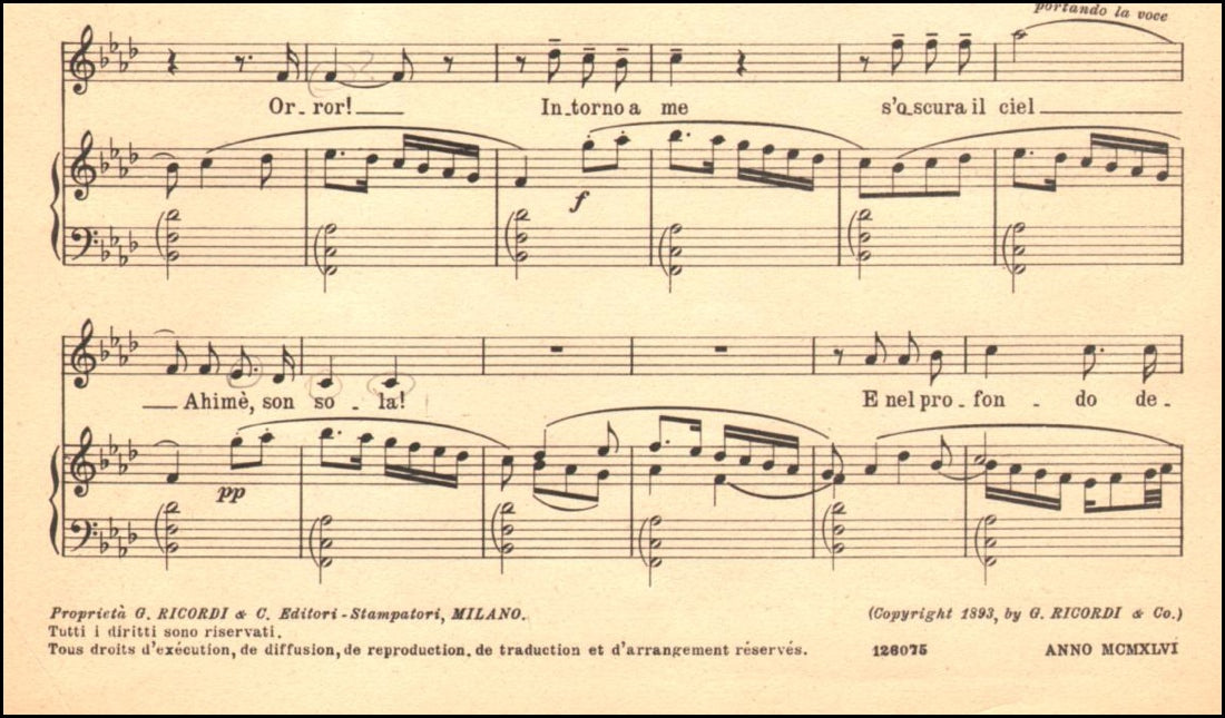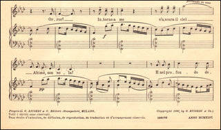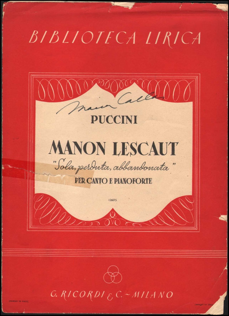 Printed score of the aria "Sola, perduta, abbandonata" from Puccini's "Manon Lescaut," the copy of Maria Callas, with her bold ink ownership signature on the front cover and with various pencil annotations presumably in her hand written within the music. From the sale of her Paris house. Chips to edges of cover, tear through right section of front cover repaired with tape and otherwise fine.