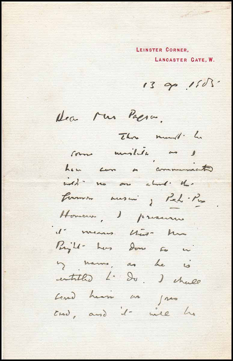 Barrie, J.M. (1860 - 1937). Autograph Letter Regarding "Peter Pan." . Fine autograph letter from the Scottish Novelist and creator of Peter Pan. Signed "J M Barrie," two pages, 8vo, Leicester Corner, Lancaster Gate, London, 13th April 1905, to Mrs. Pogson. Barrie writes: "There must be some mistake as I have been in communication with no one about the German version of Peter Pan. However, I presume it means that Mr Bright has done so in my name, as he is entitled to do. I shall send him on your card, and it will be a pleasure to me if this matter is answered as you propose. If I am in London at the same time as you I shall be pleased to see you.." Usual horizontal fold, overall in very fine condition.