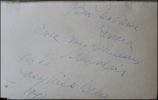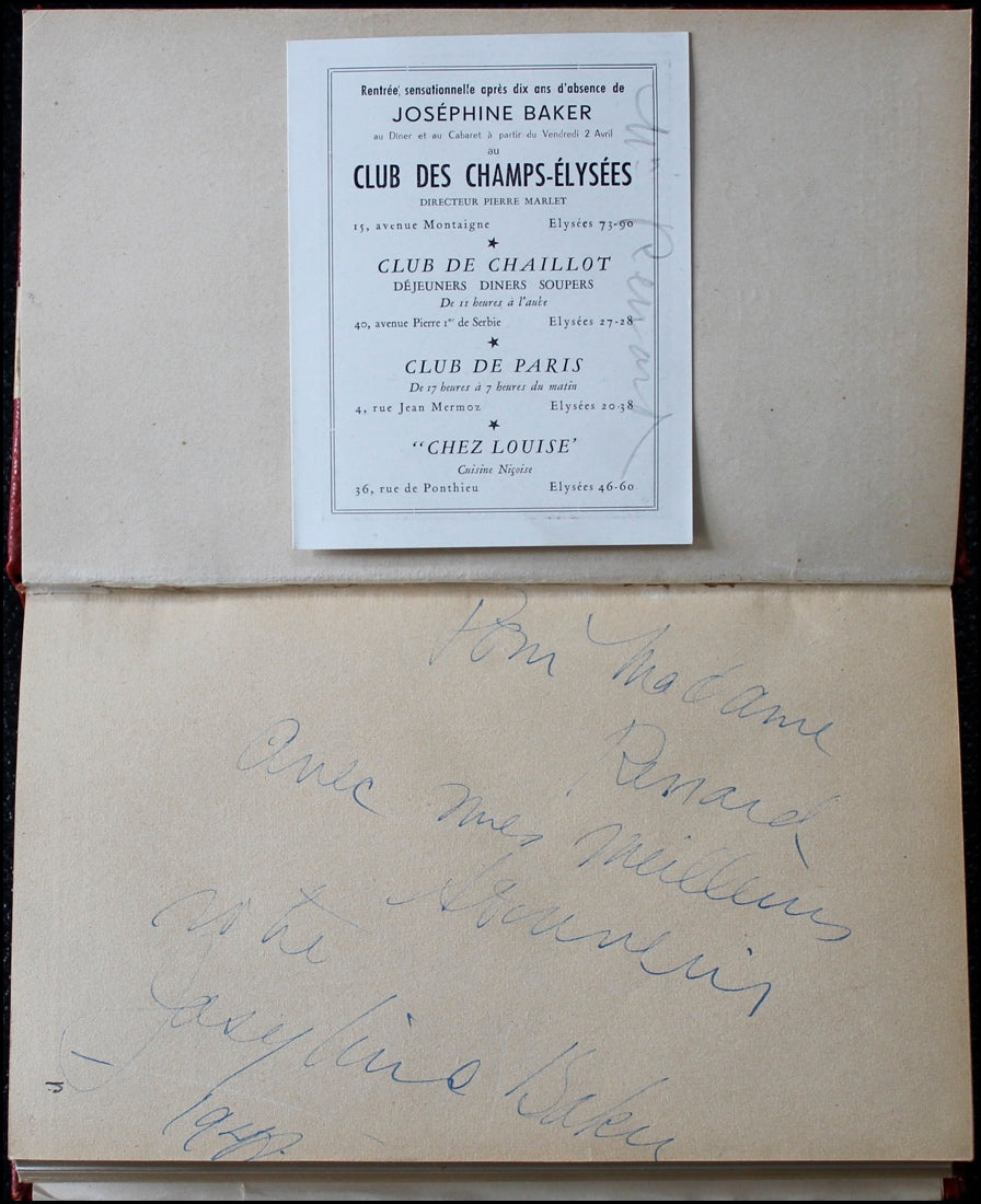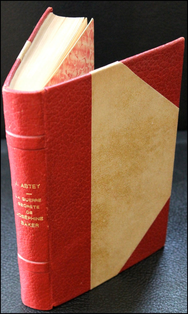 Baker, Josephine. (1906–1975). La Guerre Secrète de Joséphine Baker - SIGNED. Paris: Editions Sibonet. 1945. 323 pp with photographs and a facsimile reproduction of a letter from Charles de Gaulle expressing his gratitude for her valor and commending her for her invaluable contributions to the struggle for a free France. Inscribed on the front free endpaper to Madeleine Renaud: ''Avec mes meilleurs souvenirs votre Josephine Baker 1946." Original bright yellow and red printed wrappers, bound in half crimson leather over brown morocco, gilt-stamped at spine. Inner front hinge broken but block still well-attached and otherwise in very fine condition throughout. Sold together with a photographic advertisement card for a Baker performance at the Club des Champs-Elysees, presumably where the book was inscribed.