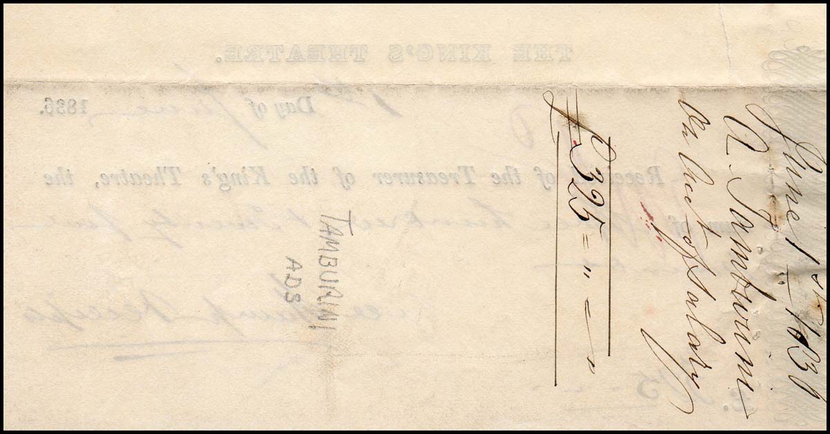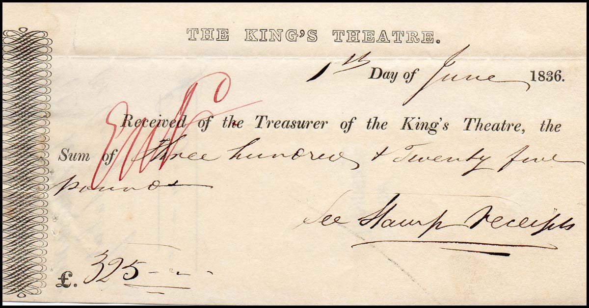 Tamburini, Antonio. (1800 - 1876). Signed 1836 King's Theatre Check. Rare signed check from the great Italian baritone, creator of numerous Bellini and Donizetti roles. Business check, 6 x 3.25 inches, drawn on the account of The King's Theatre, for £325.00, June 1, 1836, and endorsed by Tamburini on the verso as "A Tamburini." In fine condition with a small tear along the left side.