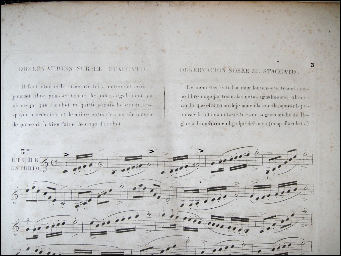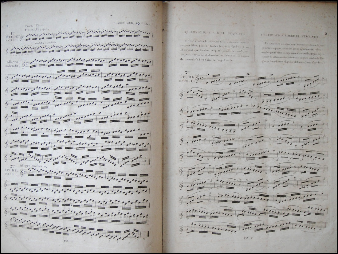 Kreutzer, Rodolphe. (1766-1831) . 40 Études ou Caprices pour le Violon - Early Spanish Edition. [ca. 1830]. 55 pp. Engraved throughout, [PN] 197 F. An early Spanish language edition, with parallel texts in French and Spanish. The front and rear wrappers seemingly pasted over and transfer-stained with the multiple other texts including a much later title page for the Etudes leaving only the plate number as a clue to this edition and a manuscript note on the inner front wrapper, "quarante Etudes de Creutzer [sic] a M. Rogier." Scattered foxing, creasing, generally worn.