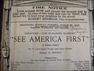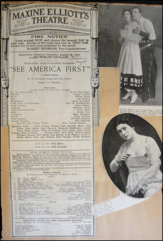 Rare Scrapbook page with the cast and credits page, as well as the cast list, list of scenes and musical numbers performed from the March 28, 1916 Opening Night performance (with the date having been underlined in pen and "Opening Night" written in pen below the date) of the comic opera "SEE AMERICA FIRST" at Maxine Elliott's Theatre in NYC where it opened on March 28, 1916, closing after only 15 performances. Music and Lyrics by Cole Porter (his Broadway debut). 9.25 inches x 13.75 inches and has the cast and credits page, cast list, list of scenes and musical numbers performed pasted to the left of the scrapbook page, with 2 promotional clippings from "See America First" pasted to the right of the scrapbook page. Some wear to scrapbook, the program itself mostly fine, pasted down.