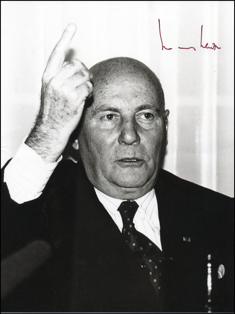 Dramatic signed photograph of the German composer, shown gesturing with his finger as if to say, "just a bit louder." 14 x 18.5 cm. Very fine.