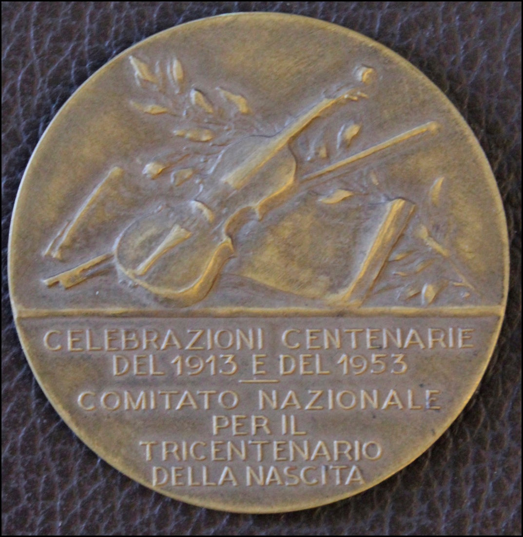 Bronze left-facing portrait bust medal, unsigned, 1953. The verso encircled with the text: "CELEBRAZIONI CENTENARIE / DEL 1913 E DEL 1953 / COMITATO NAZIONALE PER IL TRICENTENARIO DELLA NASCITA." Very fine.