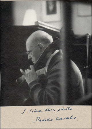 Attractive mounted halftone photograph (15 x 21 cm overall) boldly signed on the mount "I like this photo / Pablo Casals." In fine condition, sold with a group of German newspaper clippings and magazine photographs.