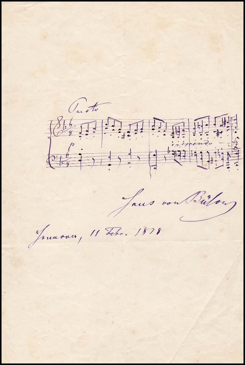 Bulow, Hans Von. (1830-1894). Autograph Musical Quotation. Boldly penned 4-measure detailed AMQS, "Presto," from the important German pianist and conductor. On a large album page signed and dated "Hannover, 11 Febr(uar) 1878." Sold together with an attractive period postcard portrait.