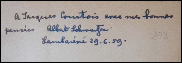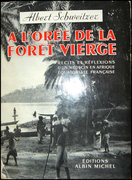 Récits et réflexions d'un médecin en Afrique Equatoriale Française. Paperback with pictorial wrappers. Signed on the first free endpage by the great Alsatian organist, philosopher, theologian and physician who is remembered for his great Bach recordings and his inspiring work as a humanitarian. Schweitzer won the Nobel Peace Prize in 1953 for founding the Lambarene Hospital in Gabon, west central Africa. Covers heavily worn and separating at spine.