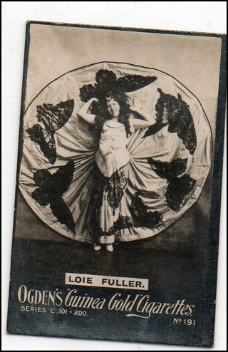Ogden's cigarette card photograph of Fuller shown in her most famous type of dance, her billowing dress whirling in motion about her. 3.5 x 5.5 cm.