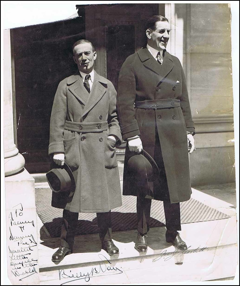 [Belle Époque] Corbett, James John "Gentleman Jim". (1866 - 1933) & Van, Billy B. (1878 - 1950). Signed Photograph. Rare signed photograph of the first gloved heavyweight boxing champion of the world, 1892–1897, who defeated the great John L. Sullivan. Knockout oversize (approx. 10 x 13 inch) portrait of Corbett and Billy B. Van, prominent entertainer in the early decades of the 1900s who was a star, progressively, in minstrel shows, vaudeville, burlesque, the New York stage, and movies. Corbett and Van appeared together in a sketch called "Spirited Travesty" in 1922 as part of a variety show and together they toured the US and Europe.