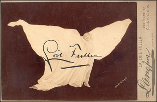 Very rare signed original cabinet card photograph by Langfier of Glasgow of Fuller in her most famous type of dance, her billowing dress whirling in motion about her. She has signed boldly in dark ink "Loie Fuller." Mounting remnants on verso, else very fine and one of very few signed images we have seen of this dance legend.