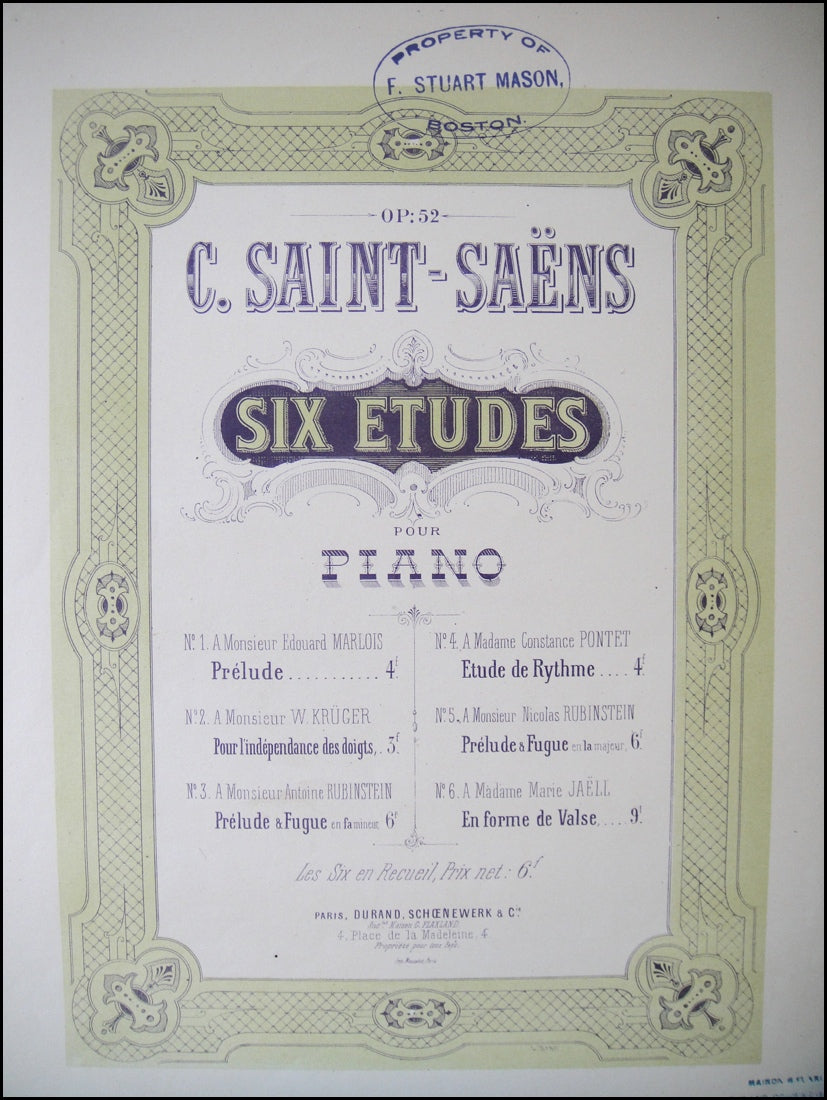 Saint-Saëns, Camille. (1835-1921). Six études pour le piano, Nr. 5 - Prélude & Fugue, Op. 52.. Paris: Durand, Schoenewerk & Cie. [ca. 1885]. First edition.