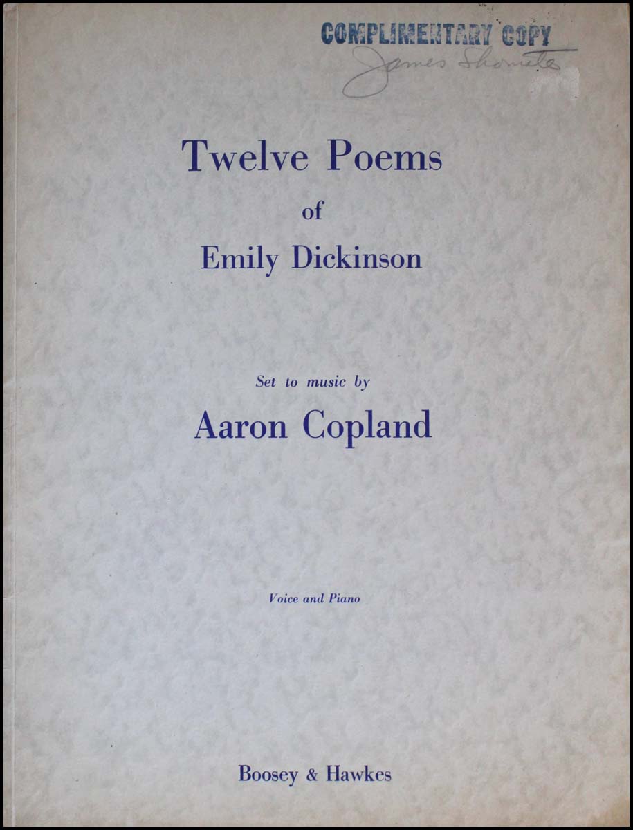 Copland, Aaron. (1900–1990). Twelve Poems of Emily Dickinson. New York: Boosey & Hawkes. 1951. First edition. Voice and Piano score. 31 cm. 45 p. [PN] B&H 17865. Original gray wrapper, in excellent condition with minor wear along the spine. Pencil marking and "Complimentary Copy" stamp on front cover; pencil markings on title page; otherwise no markings. Copland Complete Catalogue (B & H), p. 26.
