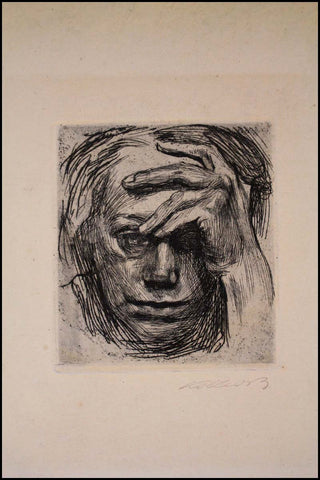 [Visual Arts] Kollwitz, Kathe. (1867-1945). [Self-portrait] Selbstbildnis mit der Hand and der Stirn. . Etching printed in black on thin, cream wove paper, 1910. Plate measures 156 x 138 mm [6 1/8 x 5 3/8 inches], wide margins, overall 250 x 352 mm. A very good impression with warm plate tone, with the stamped signature at the lower right. Klipstein 106; Knesebeck 109 V.
