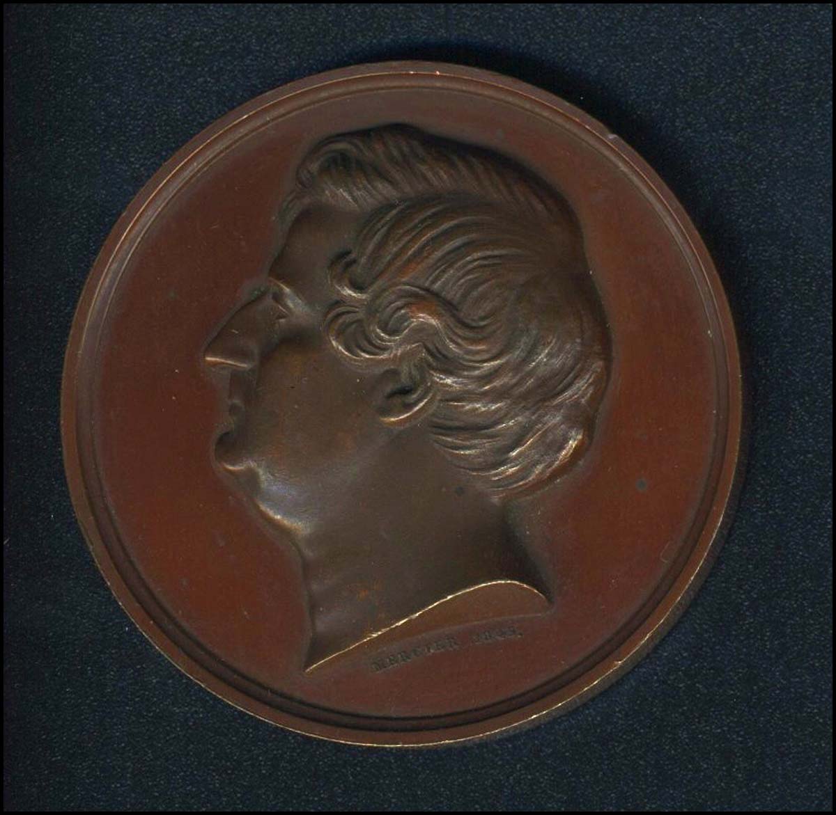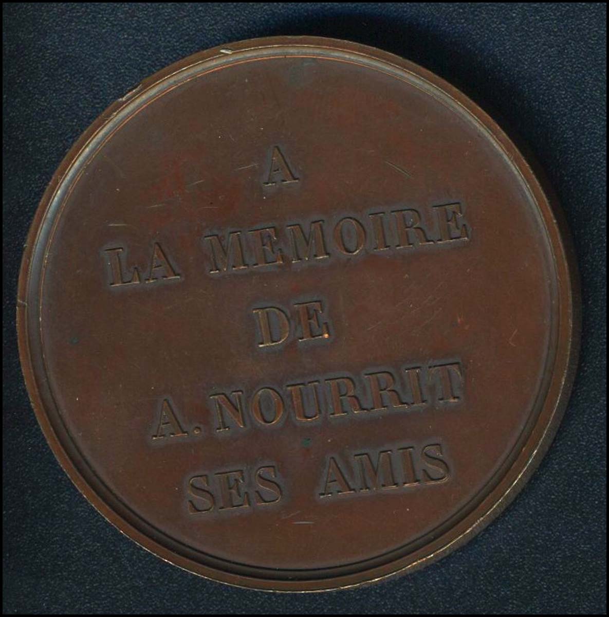 Nourrit, Adolphe. (1803–1839). 1845 Portrait Medal. 1845 copper portrait medal by Mercier, commissioned by the friends of the great tenor. Bust portrait facing left, signed "Mercier 1845" and marked "cuivre" on the edge. The verso inscribed "A / LA MEMOIRE DE / A. NOURRIT / SES AMIS." 60.5 mm. A rare medal. Andorfer & Epstein 982.