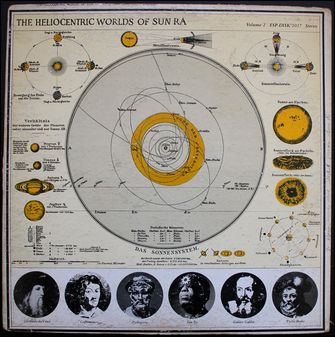 Signed album from the prolific jazz composer, bandleader, poet and philosopher known for his "cosmic philosophy," musical compositions and performances. "The Heliocentric Worlds of Sun Ra - Volume 2" (ESP-DISK 1017) signed and inscribed on the lower part of the front cover in blue ballpoint., "To Dana, Dawn and Jodi From Sun Ra." With some surface and edge wear to cover, seam splits on edges, the record is included though in apparently poor condition. Together with a modern 8 x 10 inch glossy photograph.